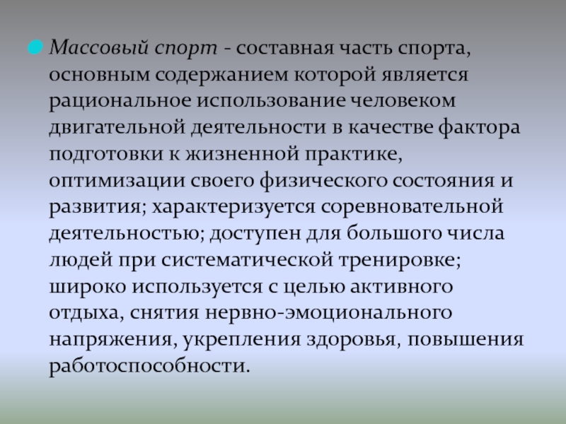 жизненной практике, оптимизации своего физического состояния и развития; характеризуется соревновательной деятельностью; доступен для большого числа людей при систематической тренировке; широко используется с целью активного отдыха, снятия нервно-эмоционального напряжения, укрепления здоровья, повышения работоспособности.