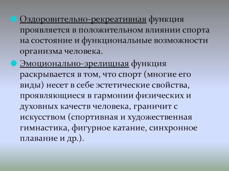 Оздоровительно-рекреативная функция проявляется в положительном влиянии спорта на состояние и