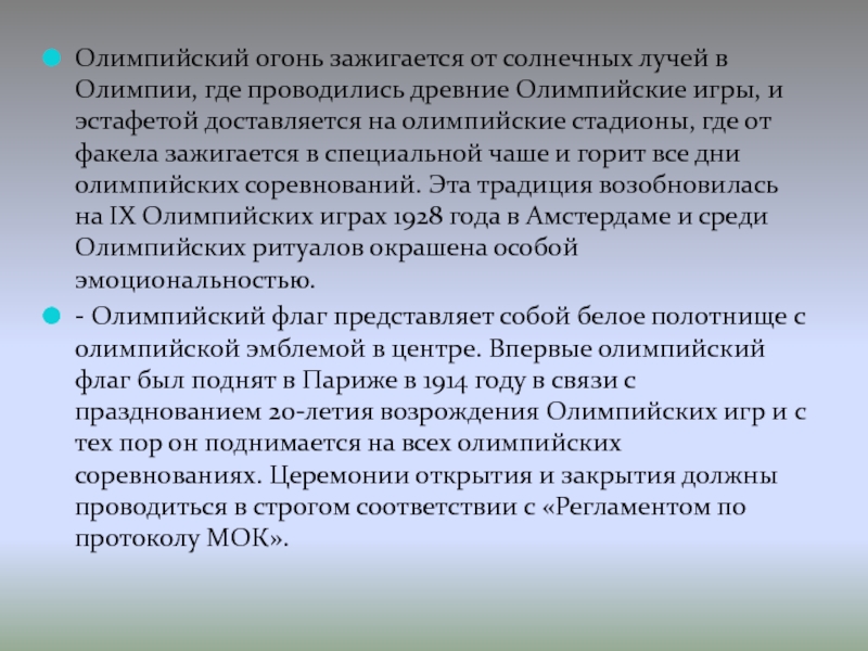 - Олимпийский флаг представляет собой белое полотнище с олимпийской эмблемой в центре. Впервые олимпийский флаг был поднят в Париже в 1914 году в связи с празднованием 20-летия возрождения Олимпийских игр и с тех пор он поднимается на всех олимпийских соревнованиях. Церемонии открытия и закрытия должны проводиться в строгом соответствии с «Регламентом по протоколу МОК».