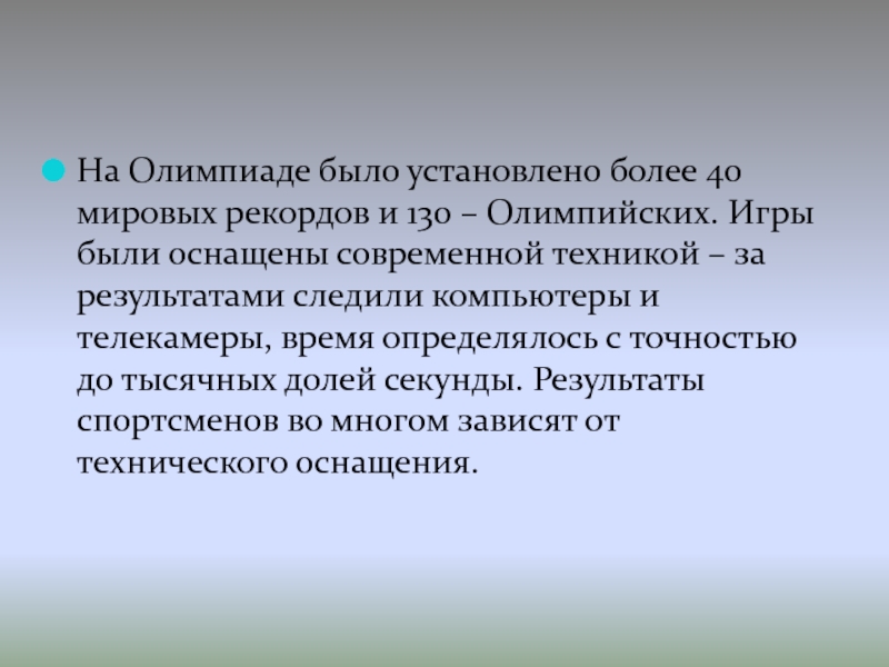 следили компьютеры и телекамеры, время определялось с точностью до тысячных долей секунды. Результаты спортсменов во многом зависят от технического оснащения.