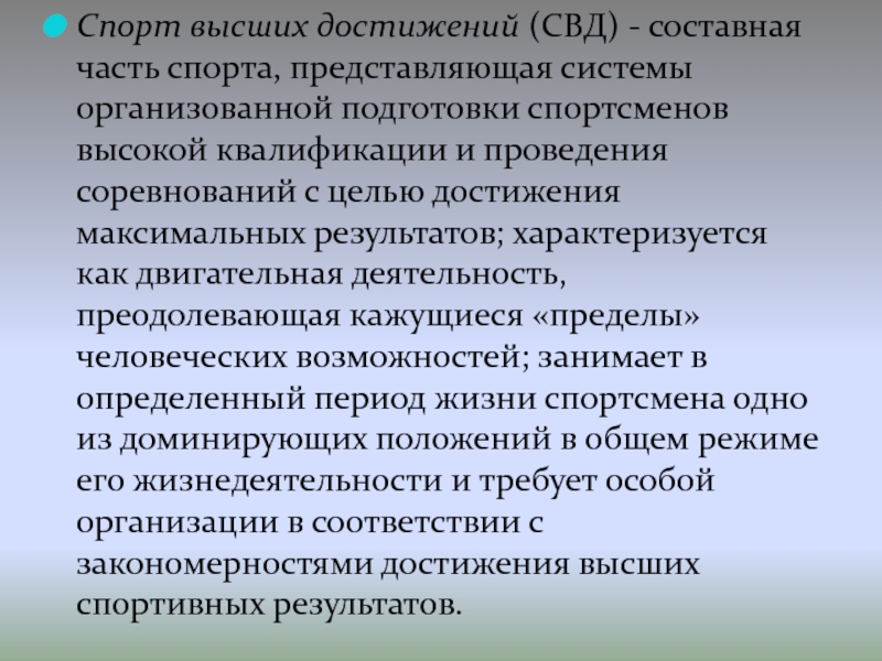 Слайд 12Спорт высших достижений (СВД) - составная часть спорта, представляющая системы