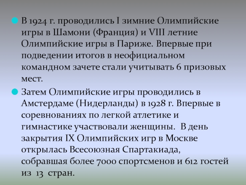 В 1924 г. проводились I зимние Олимпийские игры в Шамони