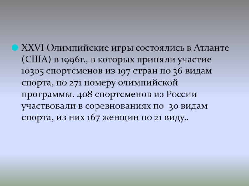 XXVI Олимпийские игры состоялись в Атланте (США) в 1996г., в