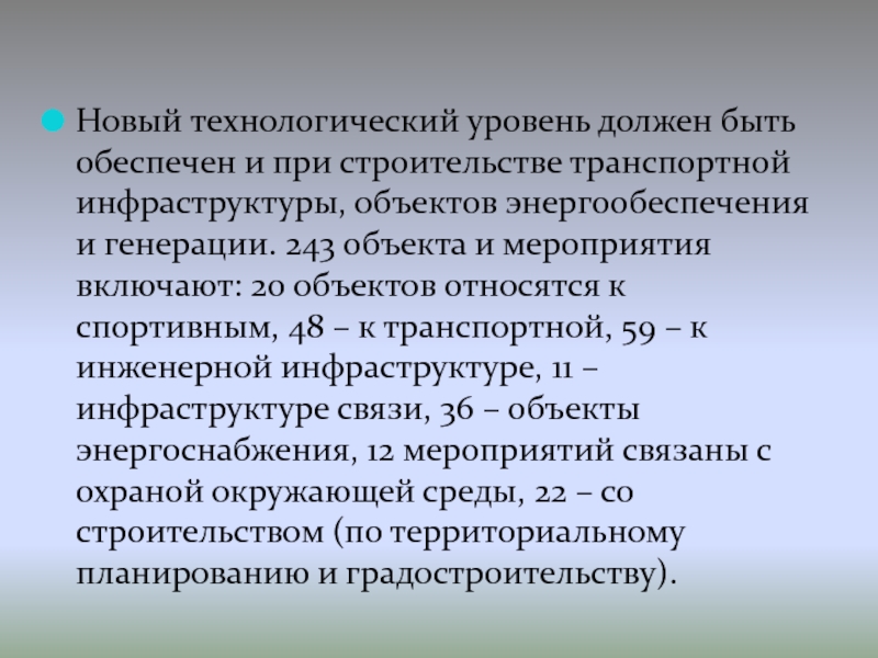 инфраструктуры, объектов энергообеспечения и генерации. 243 объекта и мероприятия включают: