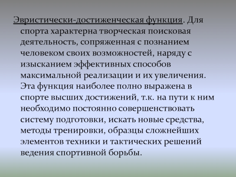 Эвристически-достиженческая функция. Для спорта характерна творческая поисковая деятельность, сопряженная с