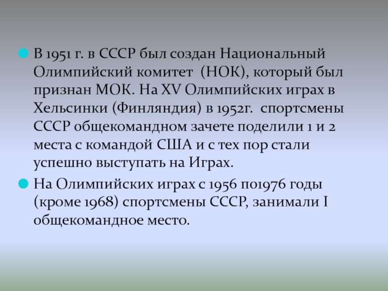 В 1951 г. в СССР был создан Национальный Олимпийский комитет