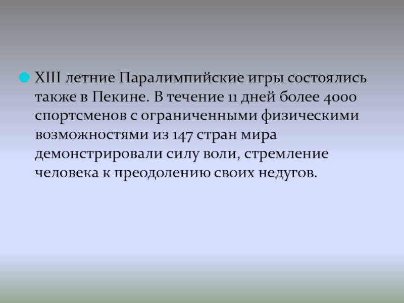 XIII летние Паралимпийские игры состоялись также в Пекине. В течение