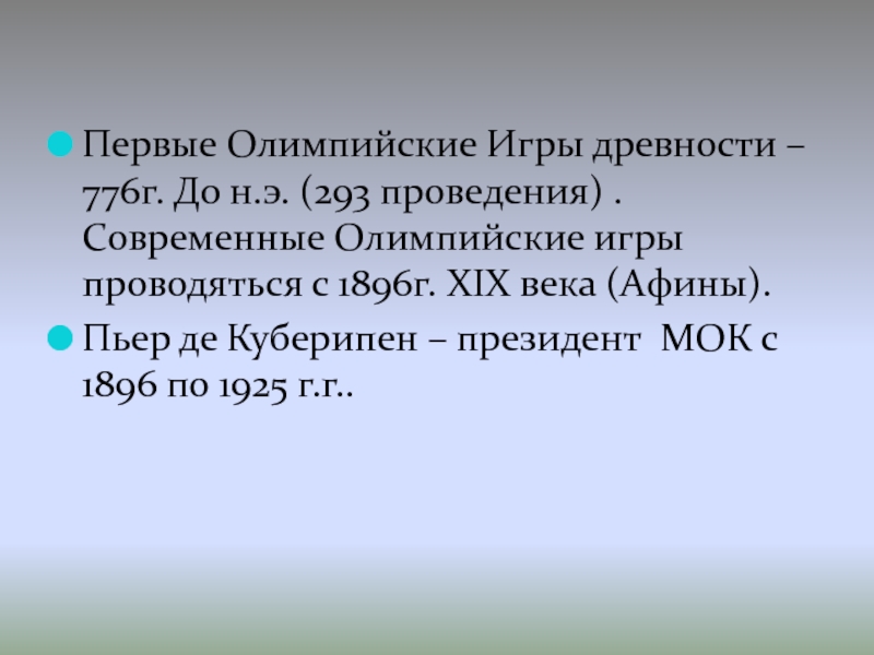 . Современные Олимпийские игры проводяться с 1896г. XIX века (Афины).