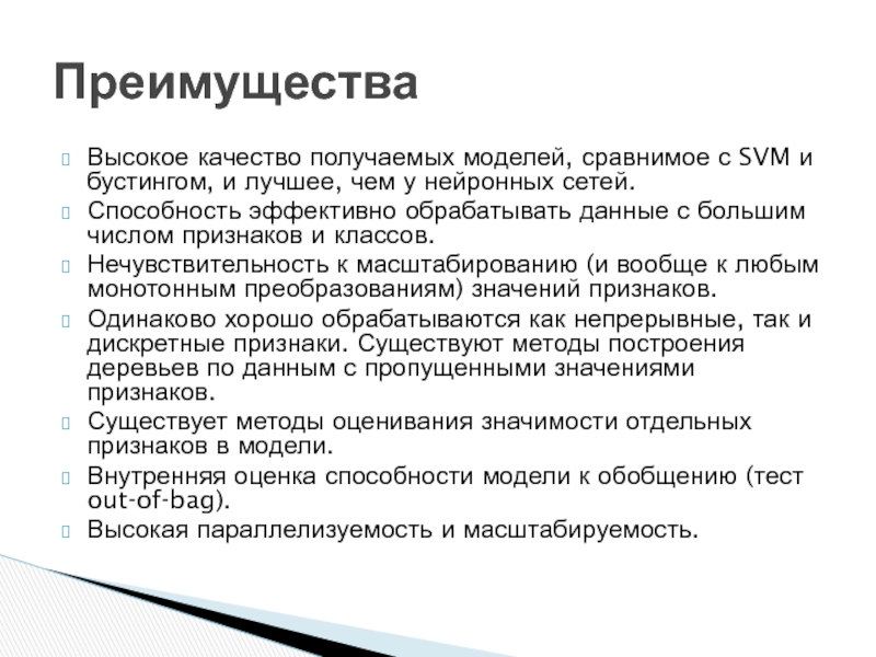 Слайд 13Высокое качество получаемых моделей, сравнимое с SVM и бустингом, и