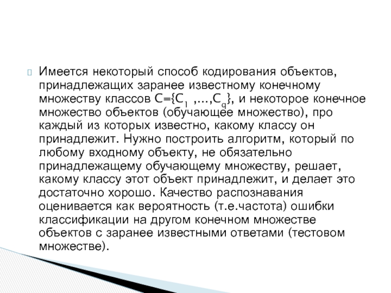 Имеется некоторый способ кодирования объектов, принадлежащих заранее известному конечному множеству классов C={C1 ,...,Cq}, и некоторое конечное множество