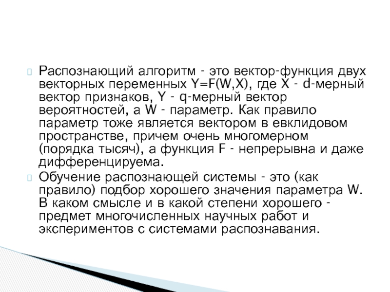 Слайд 7Распознающий алгоритм - это вектор-функция двух векторных переменных Y=F(W,X), где