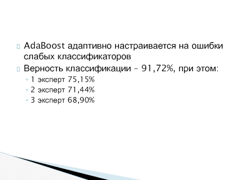 AdaBoost адаптивно настраивается на ошибки слабых классификаторовВерность классификации – 91,72%, при этом:1 эксперт 75,15%2 эксперт 71,44%3 эксперт