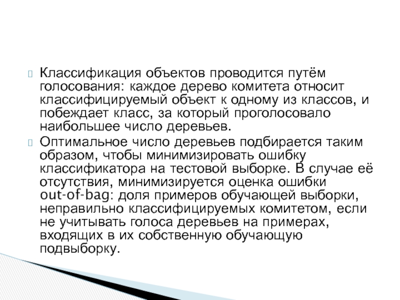 Слайд 12Классификация объектов проводится путём голосования: каждое дерево комитета относит классифицируемый