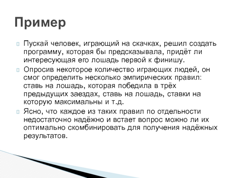Слайд 17Пускай человек, играющий на скачках, решил создать программу, которая бы