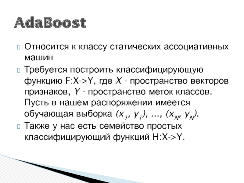 Относится к классу статических ассоциативных машинТребуется построить классифицирующую функцию F:X->Y, где X - пространство векторов признаков, Y