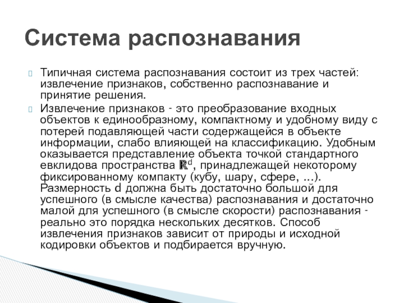 к единообразному, компактному и удобному виду с потерей подавляющей части содержащейся в объекте информации, слабо влияющей на классификацию. Удобным оказывается представление объекта точкой стандартного евклидова пространства Rd, принадлежащей некоторому фиксированному компакту (кубу, шару, сфере, ...). Размерность d должна быть достаточно большой для успешного (в смысле качества) распознавания и достаточно малой для успешного (в смысле скорости) распознавания - реально это порядка нескольких десятков. Способ извлечения признаков зависит от природы и исходной кодировки объектов и подбирается вручную.
