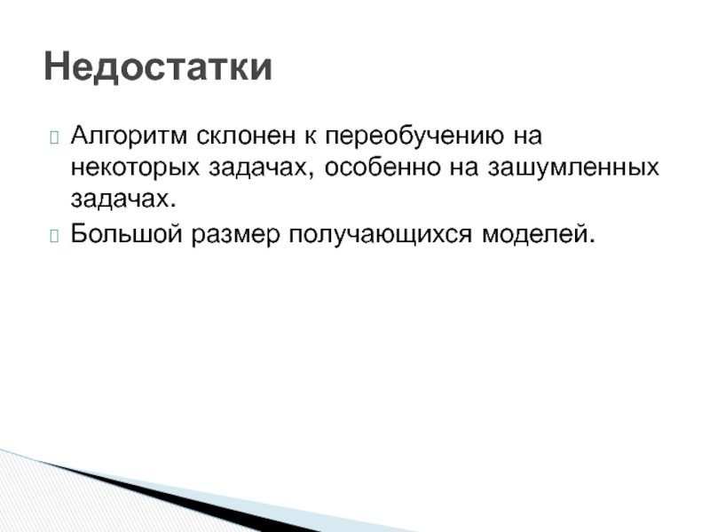 Алгоритм склонен к переобучению на некоторых задачах, особенно на зашумленных задачах.Большой размер получающихся моделей.Недостатки