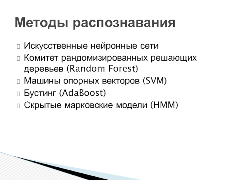 Искусственные нейронные сетиКомитет рандомизированных решающих деревьев (Random Forest)Машины опорных векторов (SVM)Бустинг (AdaBoost)Скрытые марковские модели (HMM)Методы распознавания