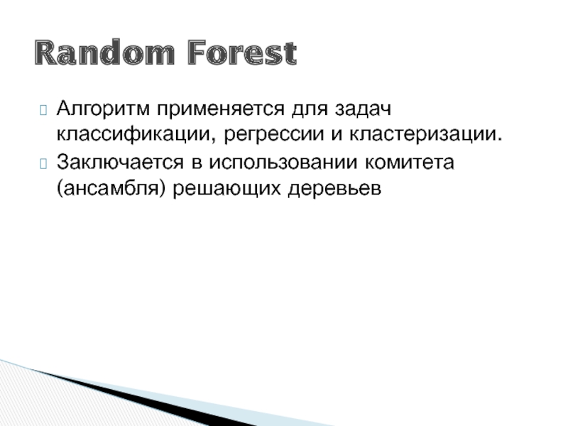 Алгоритм применяется для задач классификации, регрессии и кластеризации.Заключается в использовании комитета (ансамбля) решающих деревьевRandom Forest