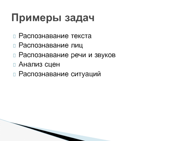 Распознавание текстаРаспознавание лицРаспознавание речи и звуковАнализ сценРаспознавание ситуацийПримеры задач