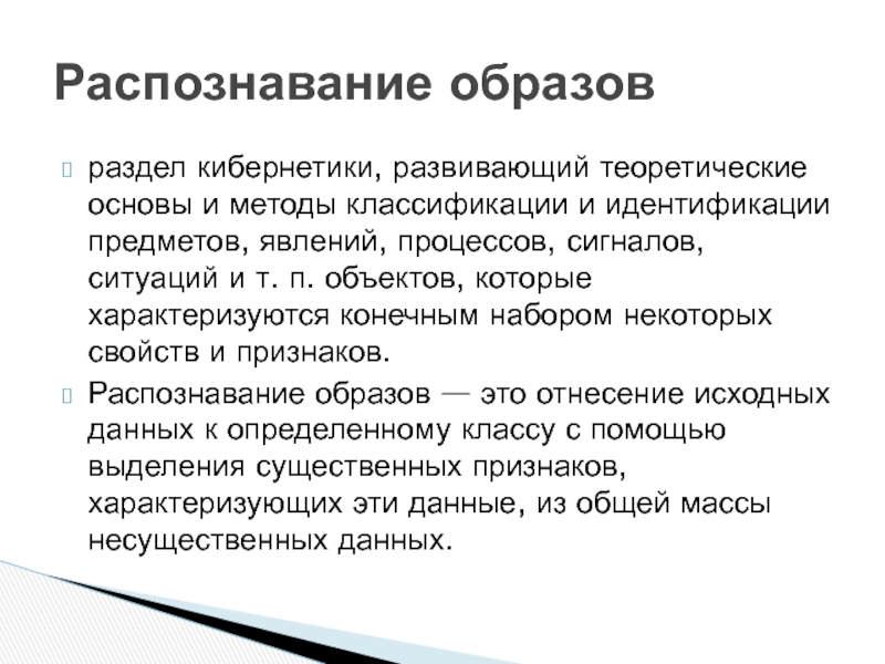 раздел кибернетики, развивающий теоретические основы и методы классификации и идентификации предметов, явлений, процессов, сигналов, ситуаций и т. п. объектов, которые характеризуются конечным набором некоторых свойств и признаков.Распознавание образов — это отнесение исходных