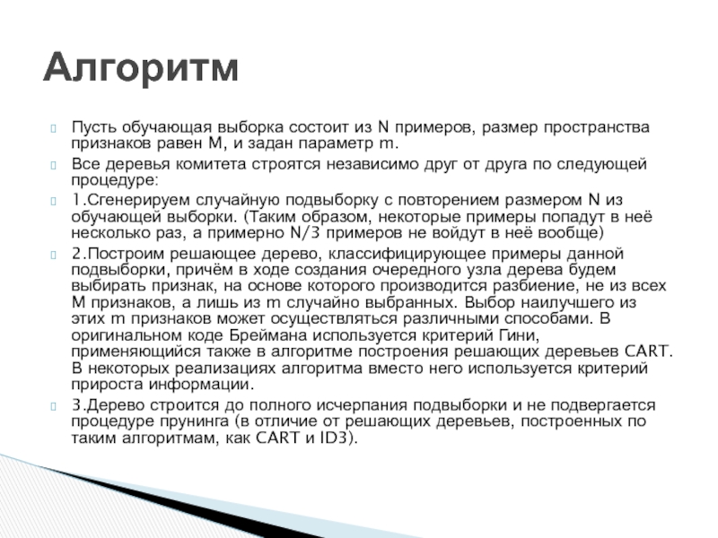Пусть обучающая выборка состоит из N примеров, размер пространства признаков равен M, и задан параметр m.Все деревья