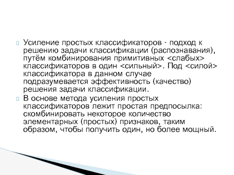 Слайд 16Усиление простых классификаторов - подход к решению задачи классификации (распознавания),