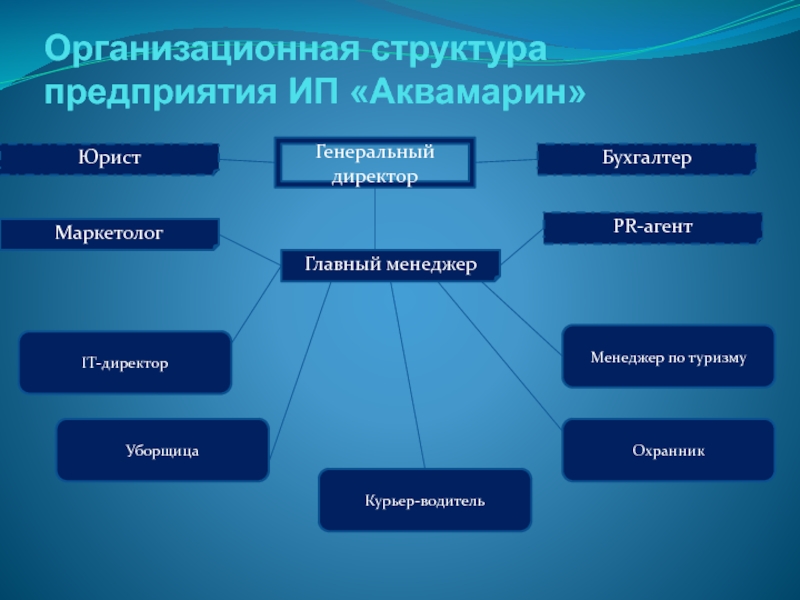 Организационная структура предприятия ИП «Аквамарин»ЮристГенеральный директорБухгалтерМаркетологГлавный менеджерPR-агентМенеджер по туризмуОхранникКурьер-водительУборщицаIT-директор