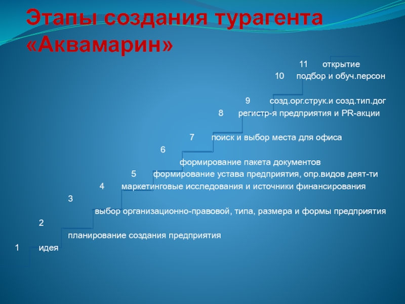 ККР по дисциплине: «Организация деятельности предприятия туризмаНа тему: «Разработка плана создания турагентства «Аквамарин»Разработал: ст-ка гр.930371Груднова Е.А