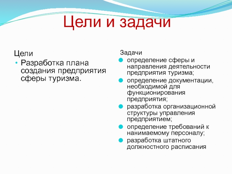 Цели и задачиЦелиРазработка плана создания предприятия сферы туризма. Задачиопределение сферы и направления деятельности предприятия туризма;определение документации, необходимой для функционирования предприятия;разработка организационной структуры управления предприятием;определение требований к нанимаемому персоналу;разработка штатного должностного расписания