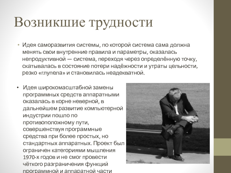 Возникшие трудностиИдея саморазвития системы, по которой система сама должна менять свои внутренние правила и параметры, оказалась непродуктивной