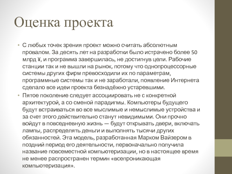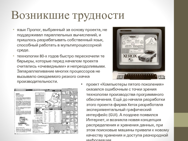 проект «Компьютеры пятого поколения» оказался ошибочным с точки зрения технологии производства программного обеспечения. Ещё до начала разработки этого проекта фирма Xerox разработала экспериментальный графический интерфейс (GUI). А позднее появился Интернет, и возникла новая концепция распределения и хранения данных, при этом поисковые машины привели к новому качеству хранения и доступа разнородной информации.