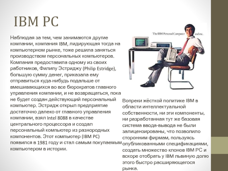 компьютеров. Компания предоставила одному из своих работников, Филипу Эстриджу (Philip Estridge), большую сумму денег, приказала ему отправиться куда-нибудь подальше от вмешивающихся во все бюрократов главного управления компании, и не возвращаться, пока не будет создан действующий персональный компьютер. Эстридж открыл предприятие достаточно далеко от главного управления компании, взял Intel 8088 в качестве центрального процессора и создал персональный компьютер из разнородных компонентов. Этот компьютер (IBM PC) появился в 1981 году и стал самым покупаемым компьютером в истории.