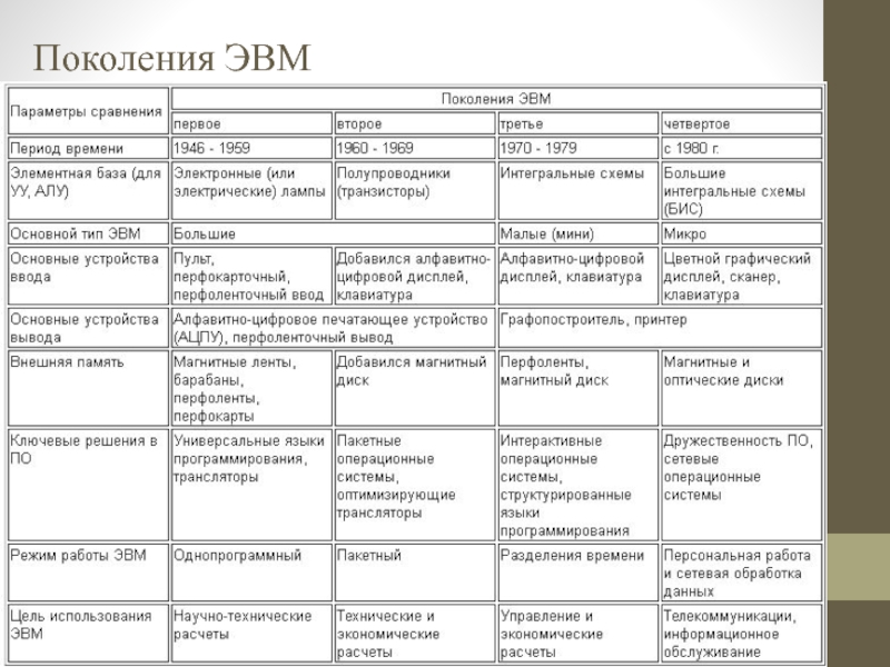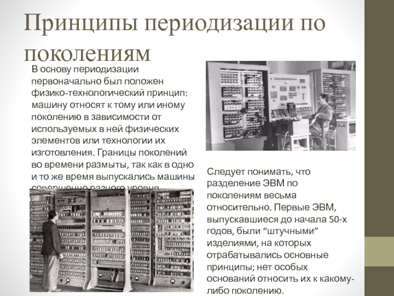 Следует понимать, что разделение ЭВМ по поколениям весьма относительно. Первые ЭВМ, выпускавшиеся до начала 50-х годов, были “штучными” изделиями, на которых отрабатывались основные принципы; нет особых оснований относить их к какому-либо поколению.