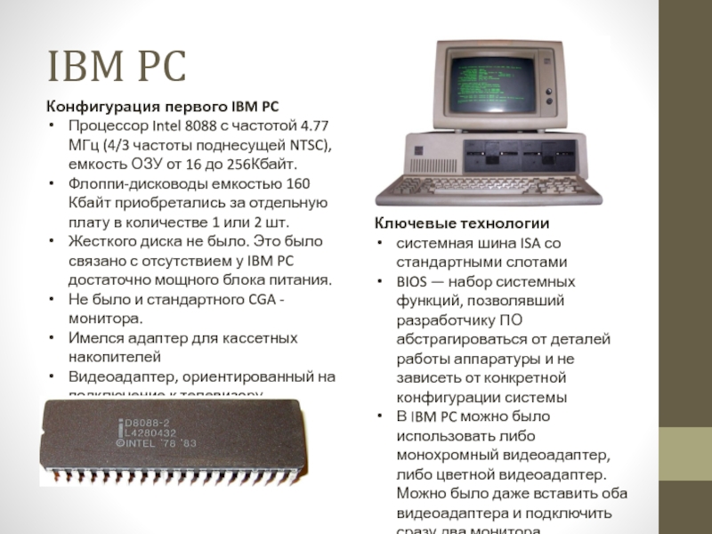 IBM PCКонфигурация первого IBM PCПроцессор Intel 8088 с частотой 4.77 МГц (4/3 частоты поднесущей NTSC), емкость ОЗУ