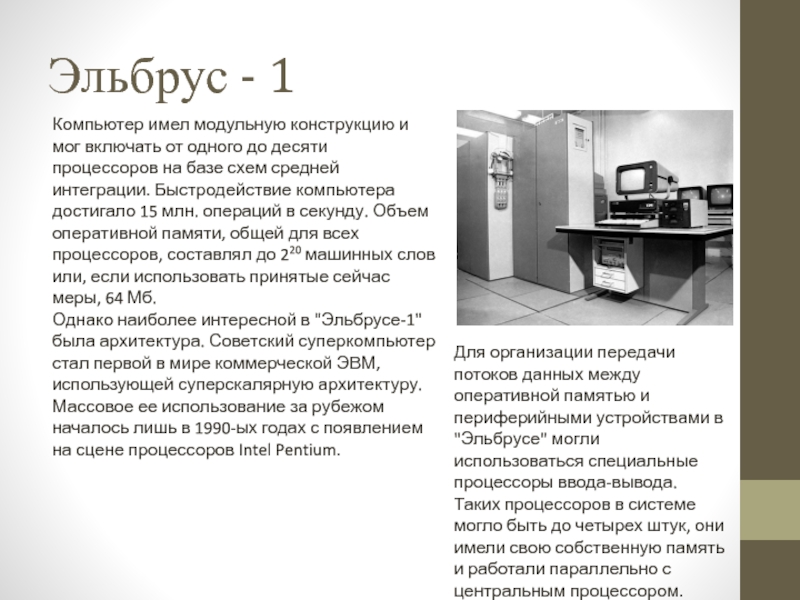 Эльбрус - 1Компьютер имел модульную конструкцию и мог включать от одного до десяти процессоров на базе схем