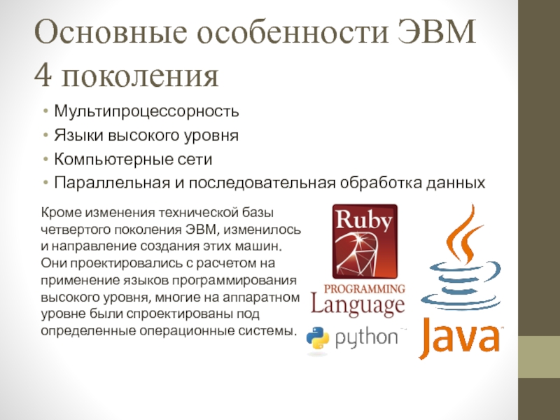 Основные особенности ЭВМ 4 поколенияМультипроцессорностьЯзыки высокого уровняКомпьютерные сетиПараллельная и последовательная обработка данныхКроме изменения технической базы четвертого поколения