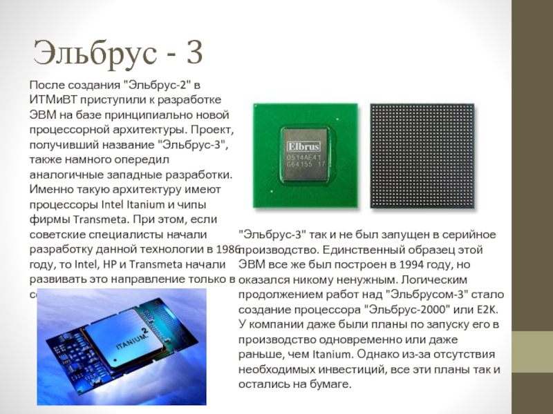 "Эльбрус-3", также намного опередил аналогичные западные разработки. Именно такую архитектуру имеют процессоры Intel Itanium и чипы фирмы Transmeta. При этом, если советские специалисты начали разработку данной технологии в 1986 году, то Intel, HP и Transmeta начали развивать это направление только в середине 1990-ых годов.