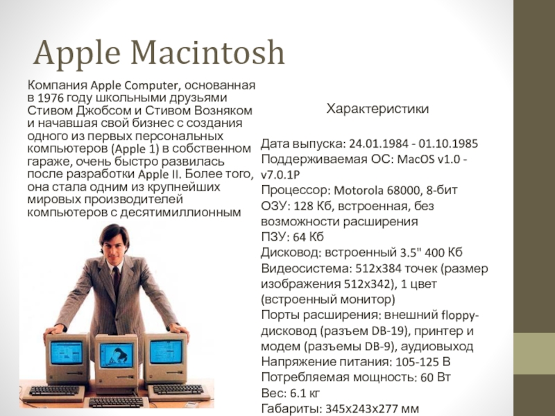 Apple MacintoshКомпания Apple Computer, основанная в 1976 году школьными друзьями Стивом Джобсом и Стивом Возняком и начавшая