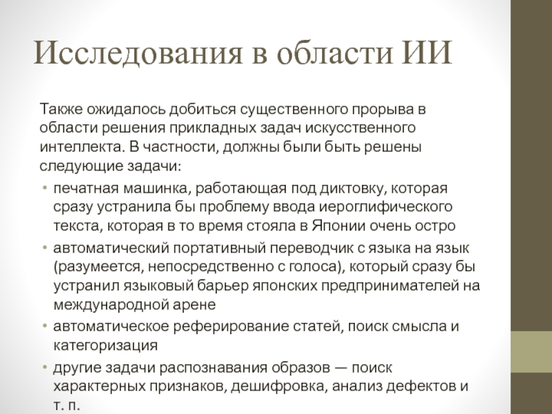 Исследования в области ИИТакже ожидалось добиться существенного прорыва в области решения прикладных задач искусственного интеллекта. В частности,