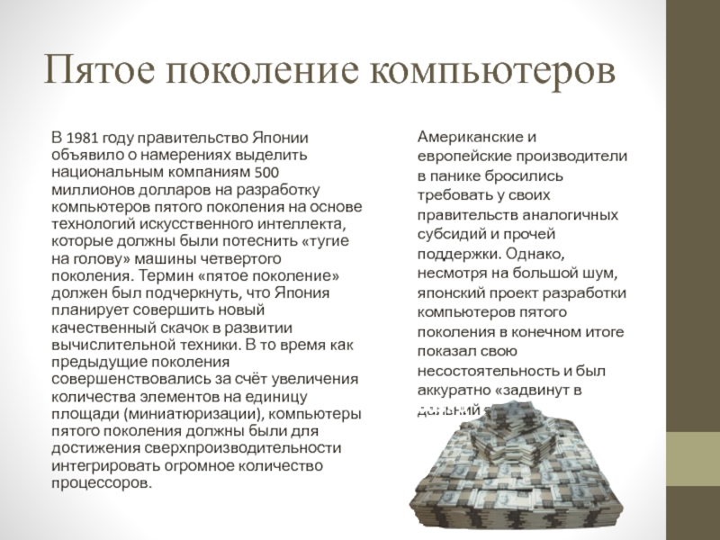 Пятое поколение компьютеровВ 1981 году правительство Японии объявило о намерениях выделить национальным компаниям 500 миллионов долларов на