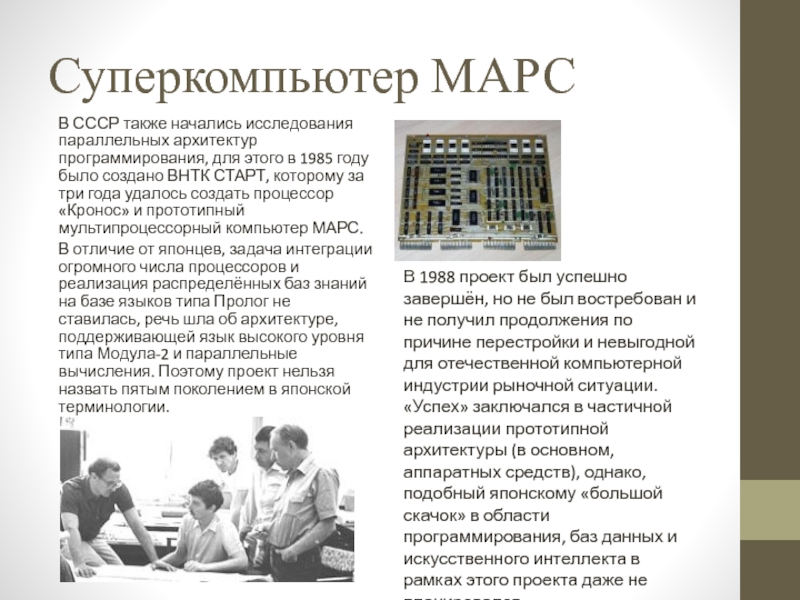 Суперкомпьютер МАРСВ СССР также начались исследования параллельных архитектур программирования, для этого в 1985 году было создано ВНТК