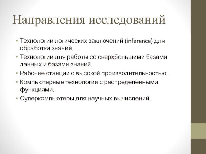 Направления исследованийТехнологии логических заключений (inference) для обработки знаний.Технологии для работы со сверхбольшими базами данных и базами знаний.Рабочие