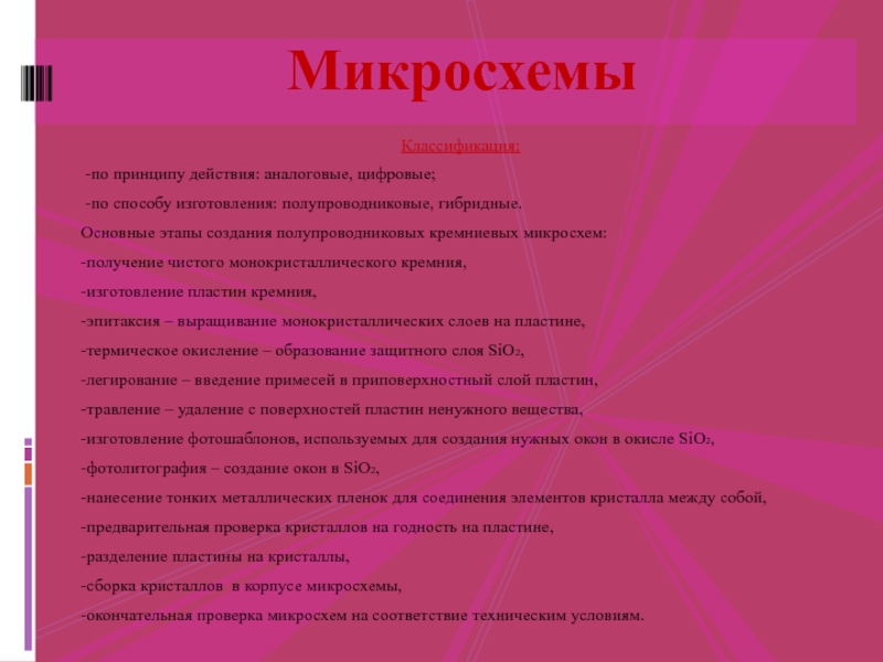 Основные этапы создания полупроводниковых кремниевых микросхем: