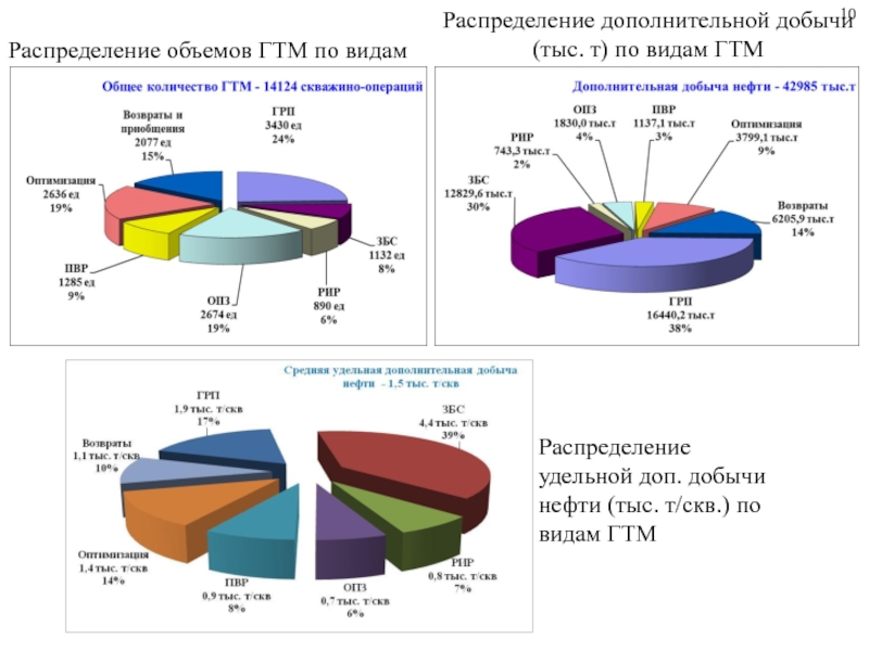 Распределение объемов ГТМ по видам10Распределение дополнительной добычи (тыс. т) по видам ГТМРаспределение удельной доп. добычи нефти (тыс.