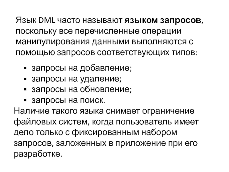 Слайд 15Язык DML часто называют языком запросов, поскольку все перечисленные операции