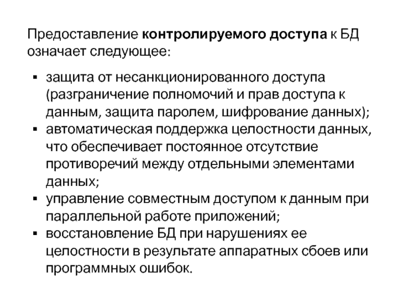 Слайд 12Предоставление контролируемого доступа к БД означает следующее: