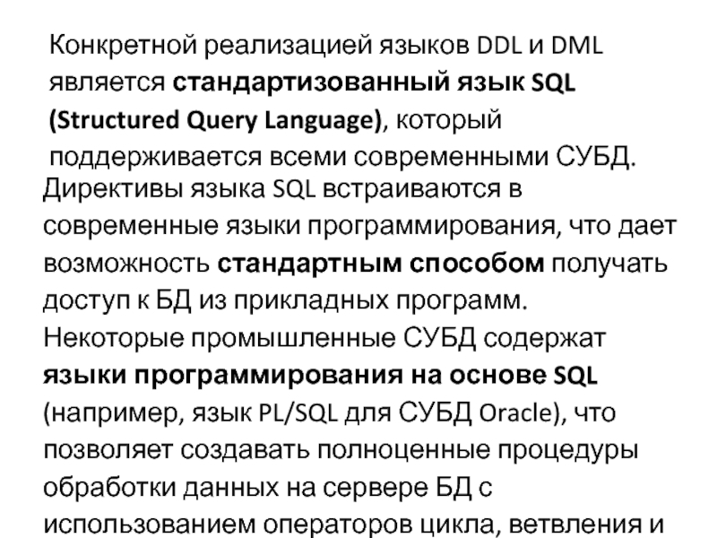 Слайд 16Конкретной реализацией языков DDL и DML является стандартизованный язык SQL