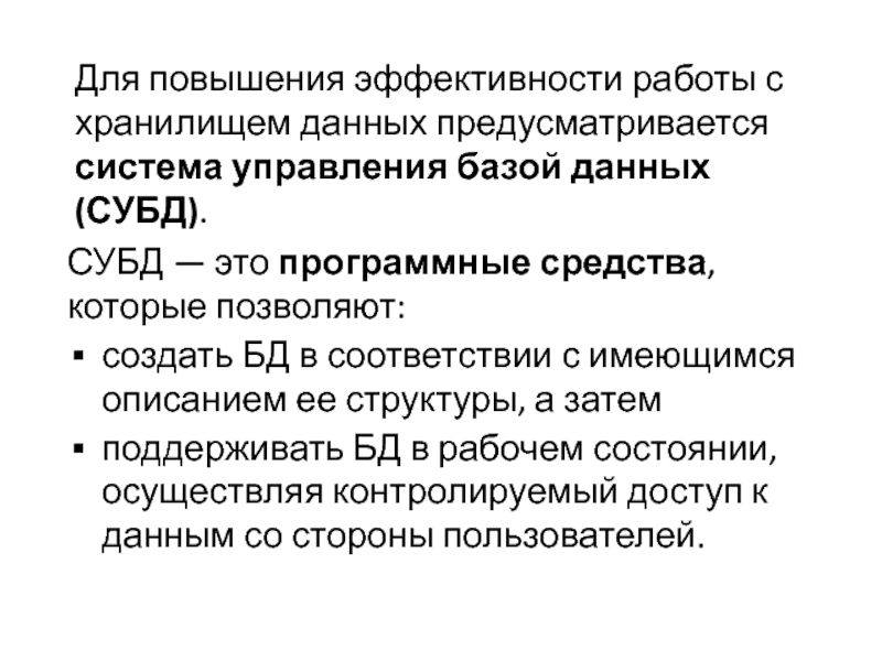 Слайд 11Для повышения эффективности работы с хранилищем данных предусматривается система управления