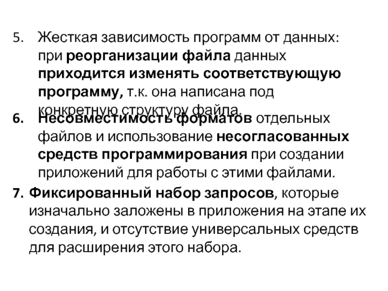 Слайд 5Жесткая зависимость программ от данных: при реорганизации файла данных приходится